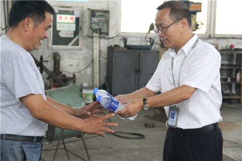 送清凉,润人心。除了配备藿香正气水、清凉油、医用酒精等防暑药品、按时发放高温补贴外,为员工发放冰镇饮料也是公司历年来坚持的防暑降温举措之一。室外气温在30℃以上时,总经理张乃明等公司领导每年都携有关部门负责人亲赴生产车间为一线员工送上冰镇矿泉水,7月8日下午,张乃明总经理来到生产一线,在送上“清凉”之余,反复叮嘱大家一定要注意身体、劳逸结合,以饱满的精神状态投入到工作中,确保目标任务如期完成。进入“三伏天”后,公司还为员工熬制降温解暑的绿豆汤,在车间还将放置大冰块降温。