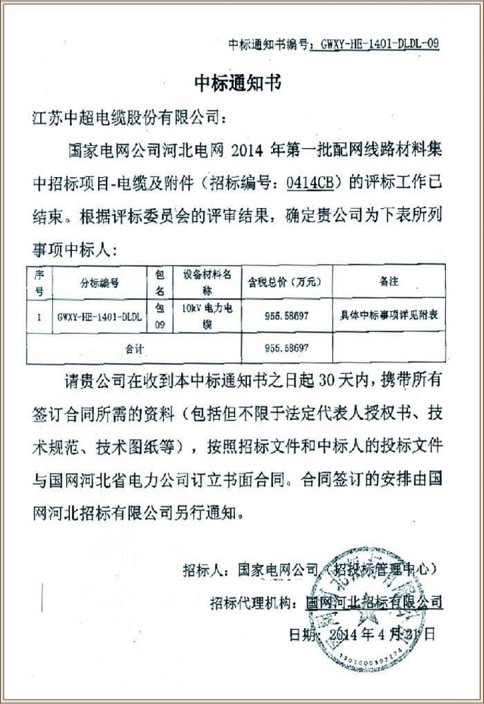 国家电网公司河北电网2014年第一批配网线路材料集中招标项目(中标号GWXY-HE-1401-DLDL-09)