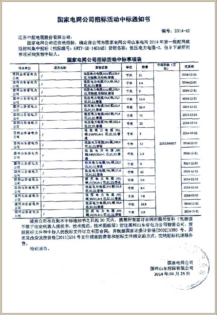 国家电网公司山东电网2014年第一批配网线路材料集中招标(中标号GWXY-SD-1401AB)