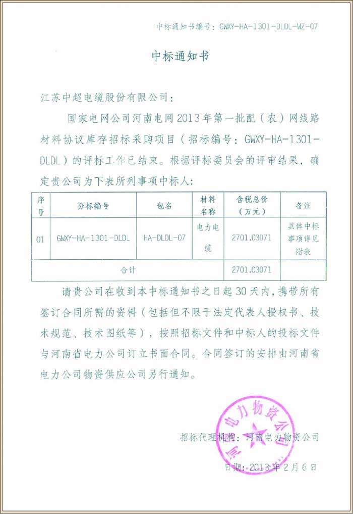 国家电网公司河南电网2013年第一批配(农)网线路材料协议库存招标采购项目(中标号GWXY-HA-1301-DLDL-WZ-07)