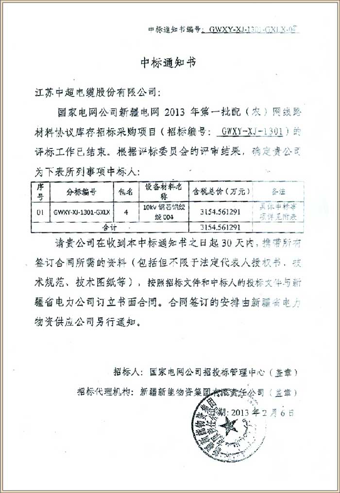 国家电网公司新疆电力公司2013年第一批配(农)网材料协议库存招标采购项目(中标号GWXY-XJ-1301-GXLX-04)