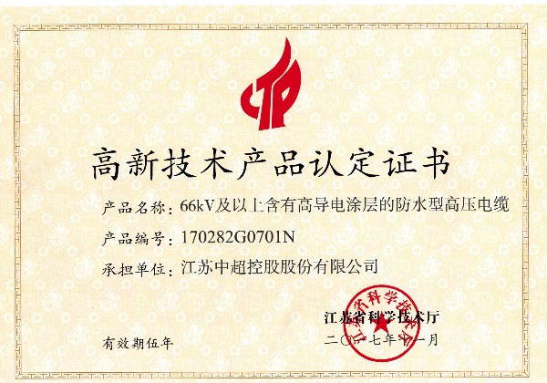 资质荣誉 > 201711 66kV及以上含有高导电涂层的防水型高压电缆——高新技术产品认定证书