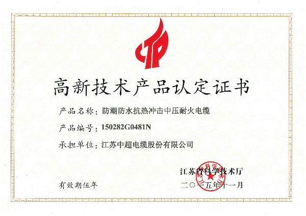 > 201509防潮防水抗热冲击中压耐火电缆——高新技术产品认定证书