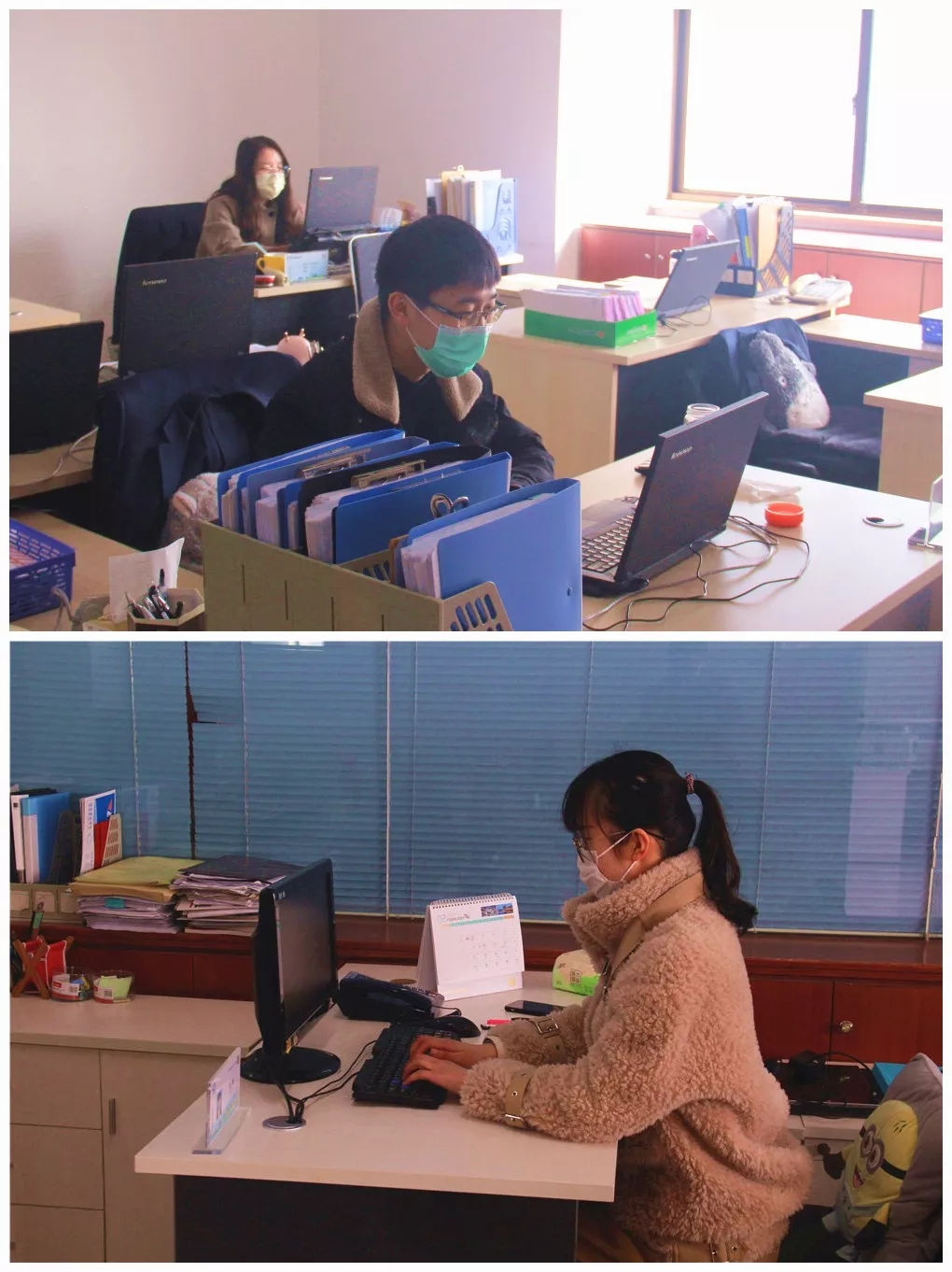 到岗人员实行分散办公,线上传递文件。要求员工做到勤通风、勤洗手、多饮水,同时注意劳逸结合。