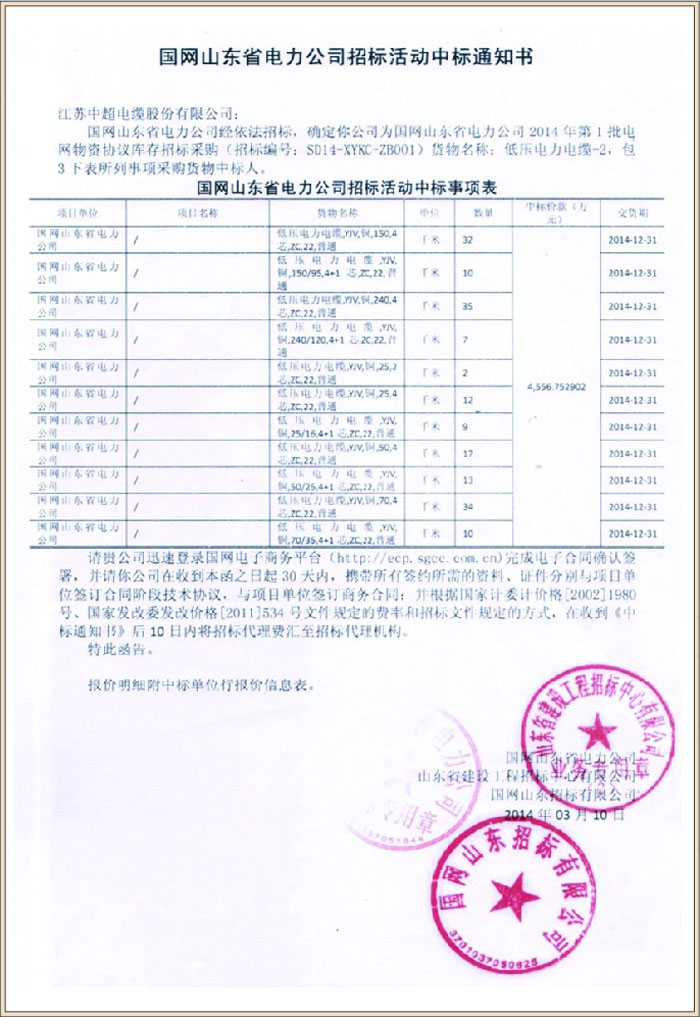 国网山东省电力公司2014年第1批电网物资协议库存集招标采购(中标号SD14-XYKC-ZB001)
