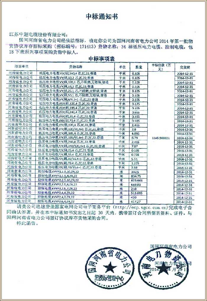国网河南省电力公司2014年第一批物资协议库存招标采购(中标号171413)