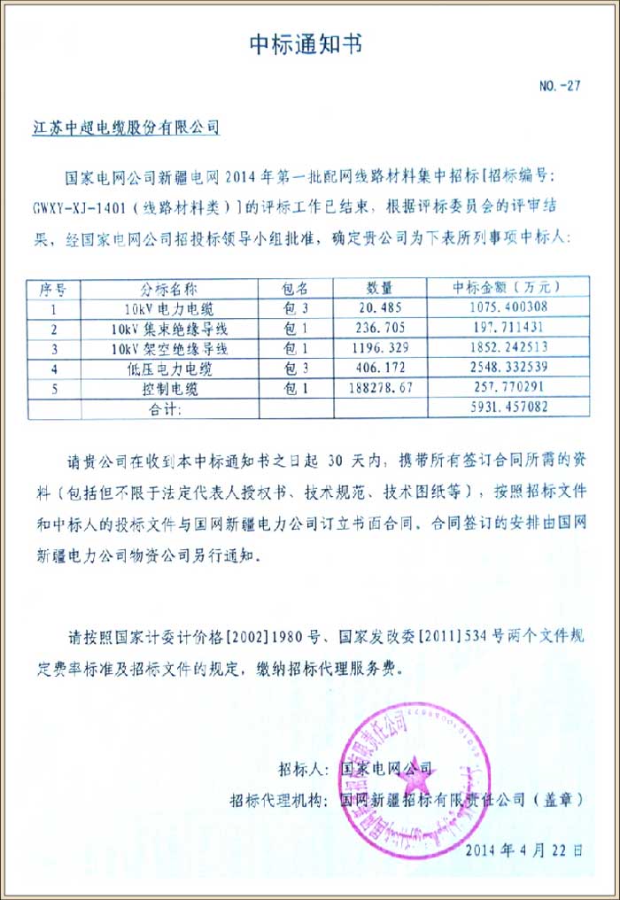 国家电网公司新疆电网2014年第一批配网线路材料集中招标(中标号GWXY-XJ-1401)