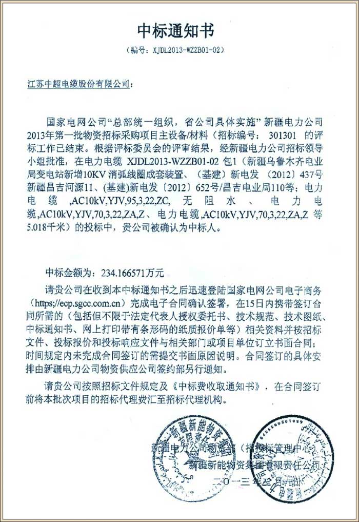 国家电网公司新疆电力公司2013年第一批物资招标采购项目(中标号XJDL2013-WZZB01-02)