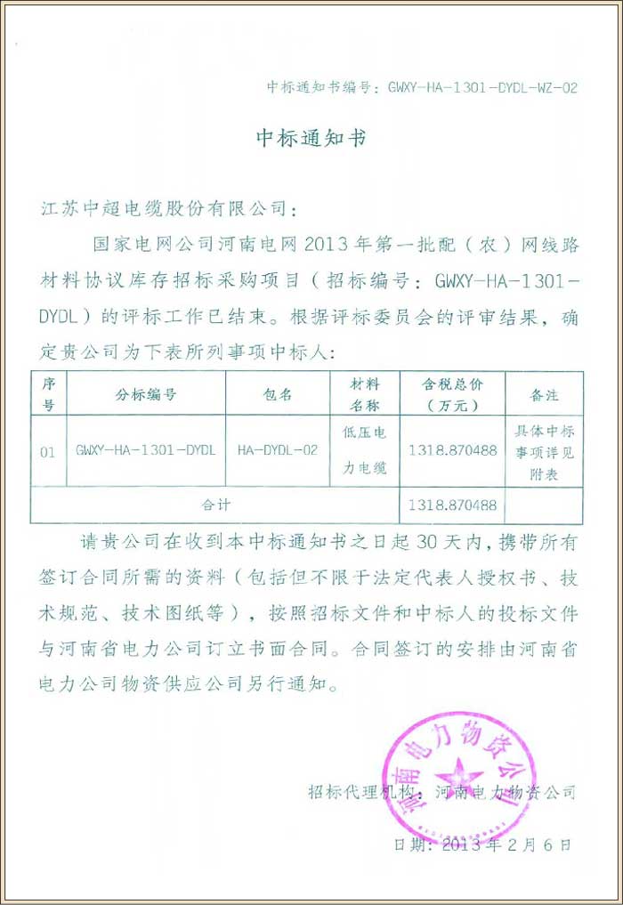 国家电网公司河南电网2013年第一批配(农)网线路材料协议库存招标采购项目(中标号GWXY-HA-1301-DYDL-WZ-02)