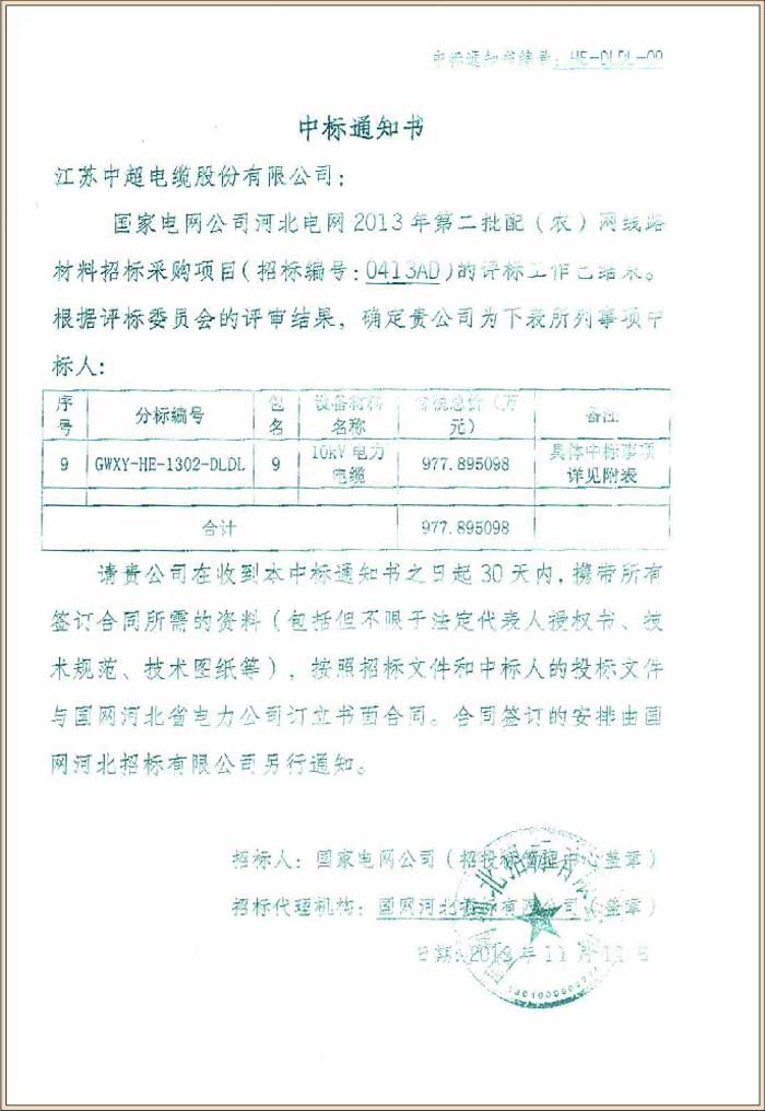 国家电网公司河北电网2013年第二批配(农)网线路材料协议库存招标采购项目(中标号HE-DLDL-09)