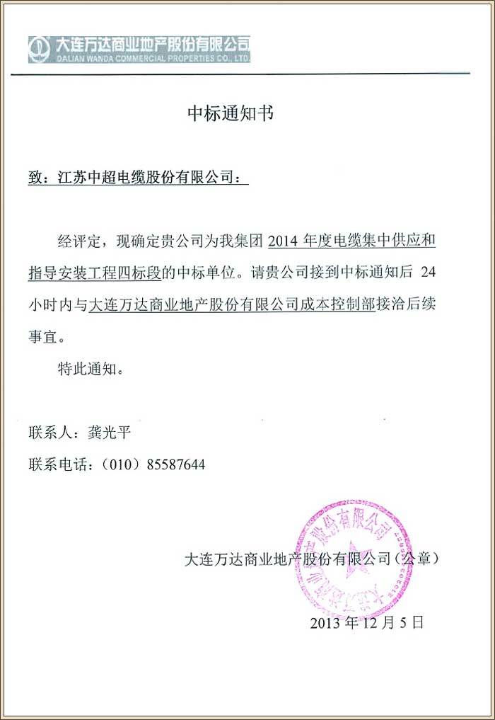 大连万达商业地产股份有限公司2014年度电缆集中供应和指导安装工程四标段项目
