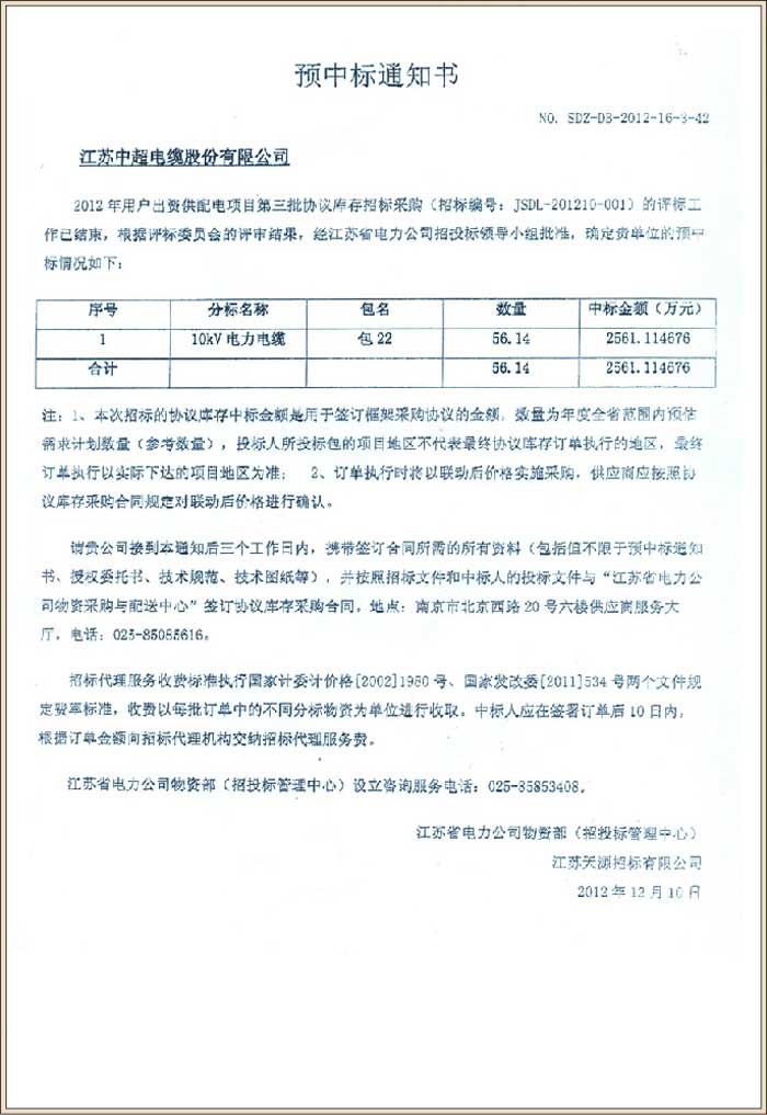 国家电网公司江苏电力公司2012年用户出资供配电项目第三批协议库存招标采购(中标号SDZ-DB-2012-16-3-42)