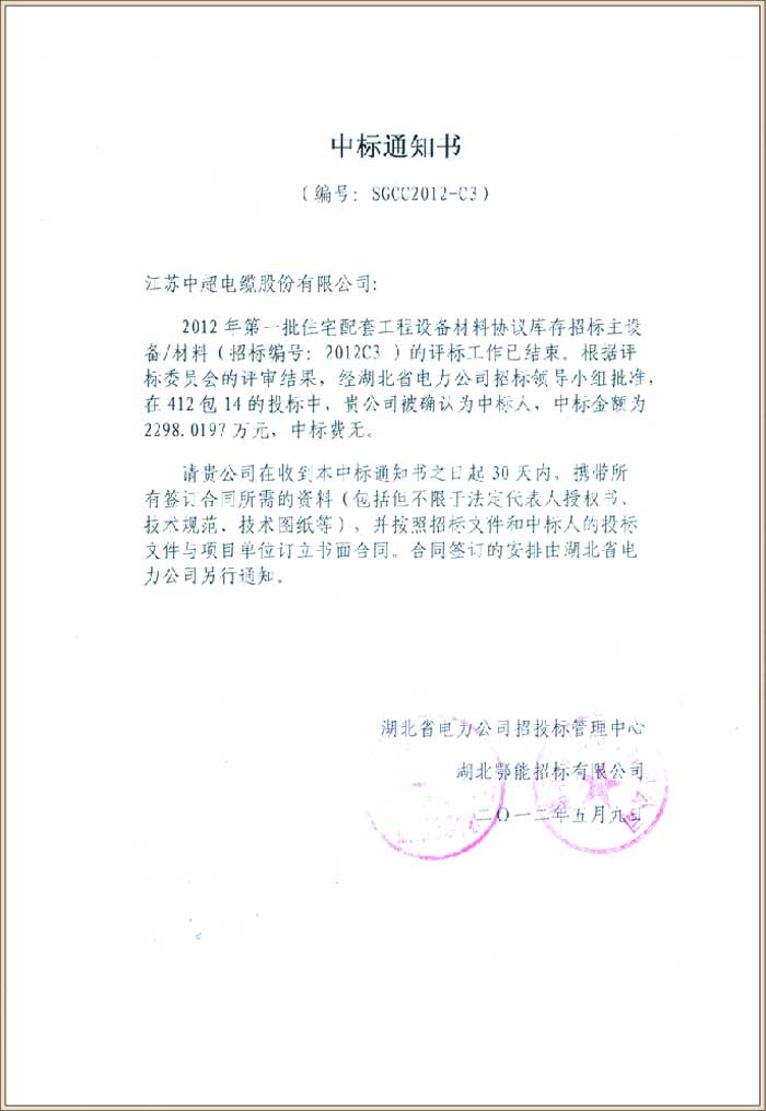 湖北省电力公司2012年第一批住宅配套工程设备材料协议库存招标(中标号SGCC2012-C3)