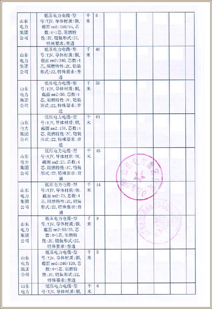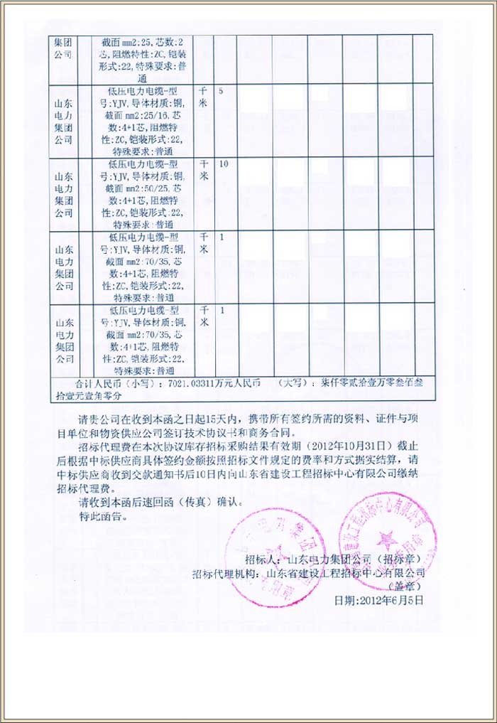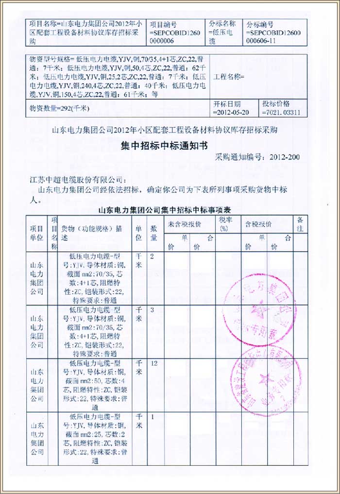 山东电力集团公司2012年小区配套工程设备材料协议库存招标采购(中标号2012-200)