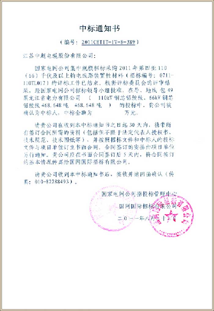 国家电网公司黑龙江省电力有限公司2011年第四批110(66)千伏及以上输电线路装置性材料(中标号2011CETIT-IV-8-389)