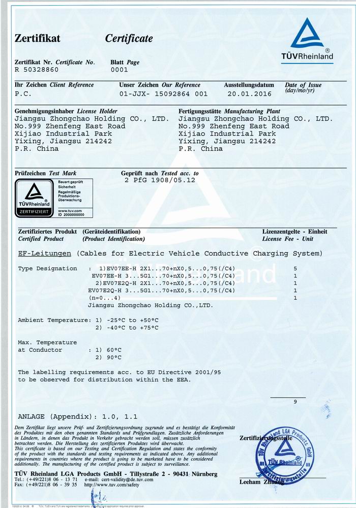 公司电动汽车充电装置电缆取得德国莱茵公司TÜV认证